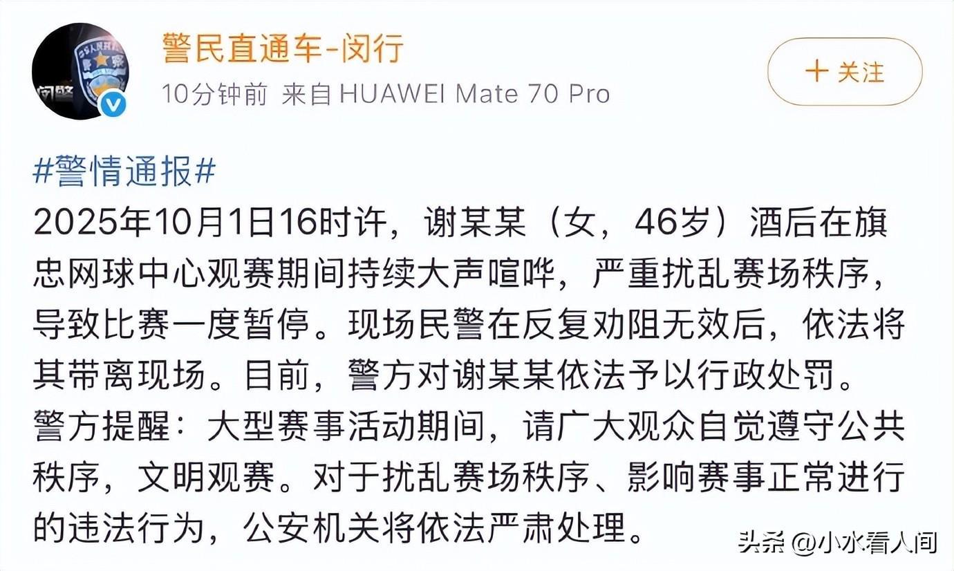 上海警方随后也发布了通报,确认酒后闹事女子为46岁的谢某某,因扰乱赛场秩序被依法处以行政处罚。但是这还没完,这位女子的家庭信息被网友曝光,让她瞬间陷入了‘社会性死亡’的境地,引发了全网更广泛的讨论。