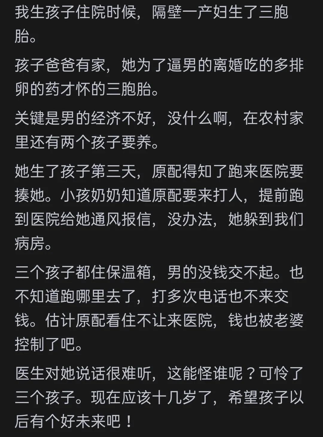 有网友爆料,自己生孩子时,隔壁床的产妇看上去才20岁左右,但床位卡片上却赫然写着52岁。每次护士来给她输液,都会忍不住问一句:“你52岁?保养得真好!”更奇怪的是,每天都有一对中年夫妻来看她,女的会照顾产妇,男的却只看小孩。一开始,大家都以为这是产妇的爸妈,但护士们确认后的反应却让人觉得不对劲。