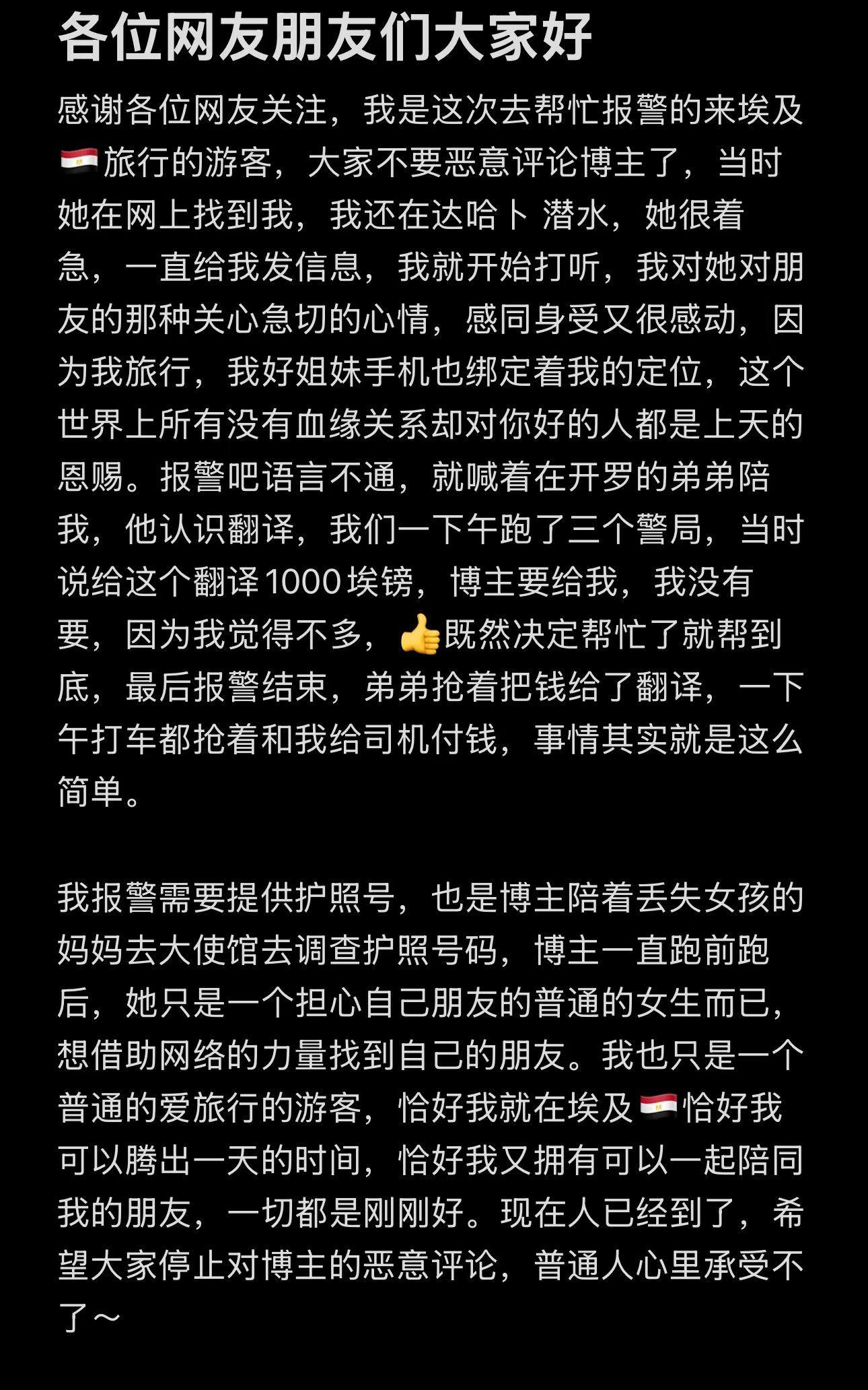 直到埃及警方发出通报,大家才明白过来,原来池广滢根本不是受害者,而是诈骗嫌疑人。