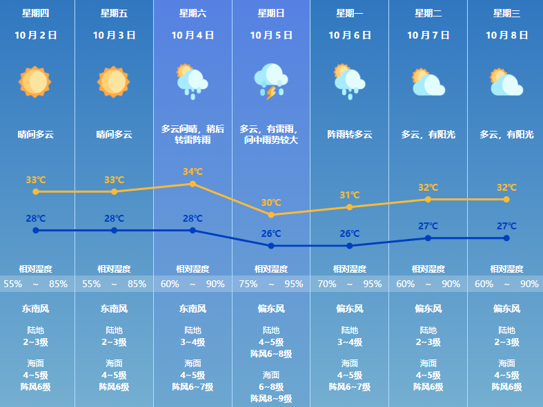 据@广东天气,预计10月2-4日白天,广东大部晴到多云;4日夜间-5日夜间,热带气旋给广东珠江口以西沿海市县和海面带来风雨影响;6-8日,广东大部多云,部分市县有(雷)阵雨。