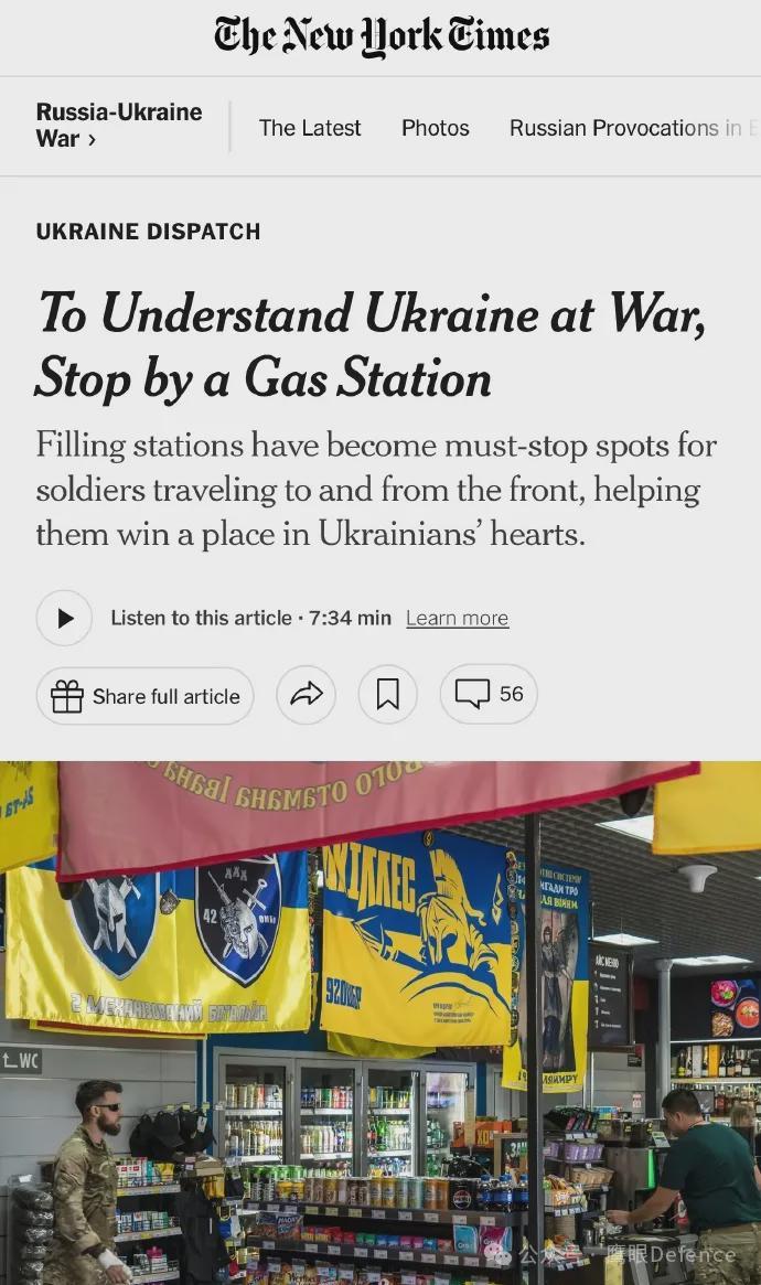 《纽约时报》的一篇文章介绍了乌克兰加油站的情况,尤其是那些靠近前线的加油站。这些战时枢纽被士兵们亲切地称为“文明第一哨所”。带着硝烟气息的乌克兰士兵们不仅能在这些加油站补充燃料,还能享受到咖啡和热狗等美食,补充能量的同时缓解战争压力。与加油站员工们聊几句,他们能重新感受到生活的美好,更加明白自己为何而战。