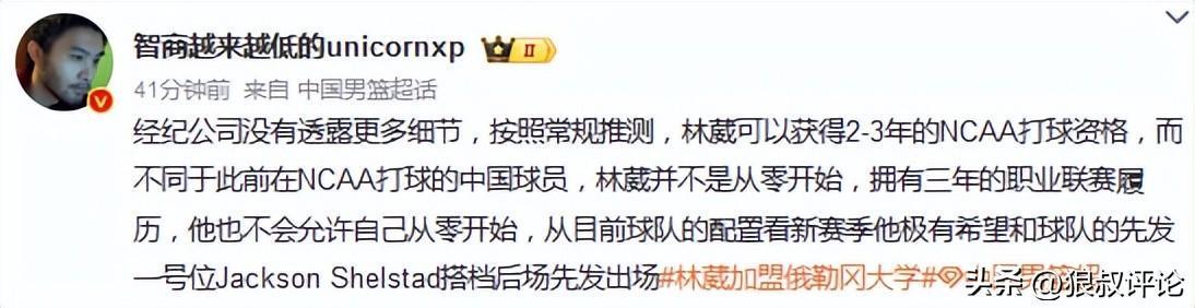 媒体人海jun的蓝也表达了对林葳的期待。他表示,林葳的经纪公司终于官宣了这一消息,这意味着他不会耽误新赛季的赛程。与其他国家的职业球员加盟NCAA的速度相比,林葳的速度算是挺快了。他很期待林葳下赛季在NCAA的表现,并希望俄勒冈大学能成为他冲击NBA的跳板。