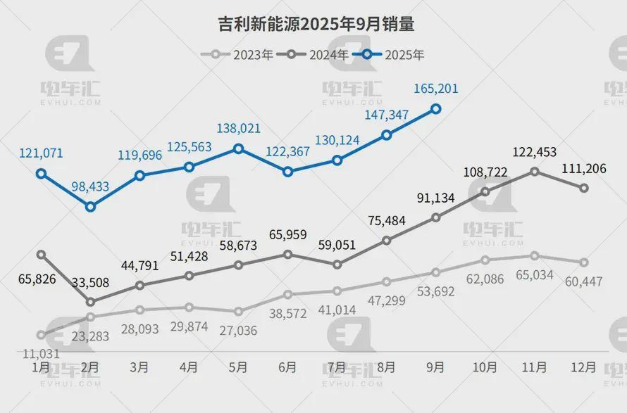 吉利新能源汽车9月销量达165,201辆,位居榜单第二,同比暴涨81.3%,环比增长12.1%。1-9月累计销量116.8万辆,同比增幅高达113.9%,增速在传统车企中表现突出。