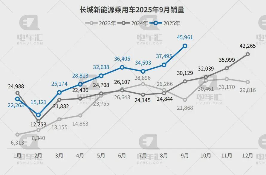 长城新能源乘用车9月交付45,961辆,同比增长52.5%,环比提升22.6%,表现出逆势增长的良好态势。近年来,长城汽车在混动技术研发与智能化领域持续加大投入,随着相关技术成果逐步落地到产品中,其市场竞争力不断提升,此次销量增长正是前期投入开始兑现的体现。