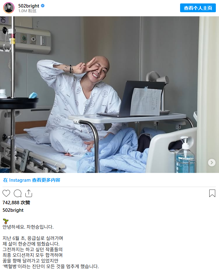 9月27日,车炫承通过个人社交媒体账号发文透露:“6月初被送进急诊室的那一刻,我的人生瞬间停滞。在此之前,我通过了所有心仪作品的最终选拔,正朝着梦想全力奔跑,但‘白血病’的诊断让一切戛然而止。”