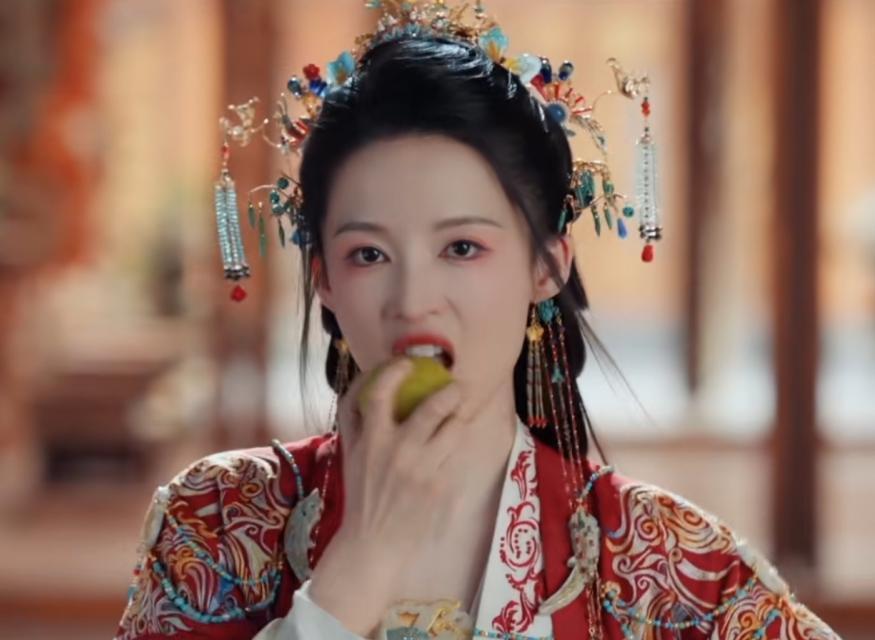这次饰演被逼和亲,命运凄苦的凤戏阳,上一秒步步生花、贤良淑德。
