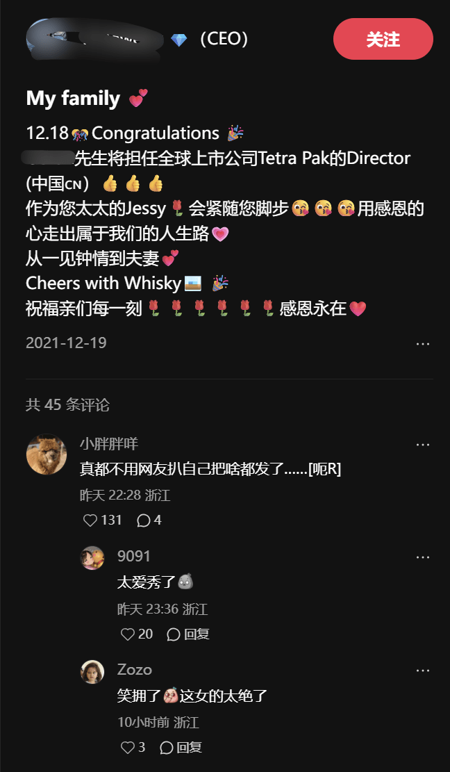 从她的社交媒体上,还可以看到她各种“高端”炫富生活的痕迹,无论是豪华的旅行、昂贵的奢侈品,还是精致的生活方式,都成为了她炫耀的资本。