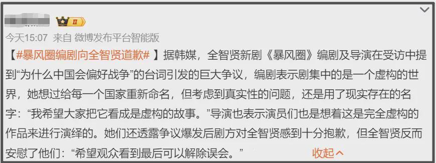 更令人无语的是,包括全智贤本人在内,《暴风圈》的全体主创没有对中国以及被抹黑的所有国家表现出哪怕一丝歉意,反而互相安慰起来。编剧和导演心疼全智贤被骂,全智贤则安慰他们说都是误会。