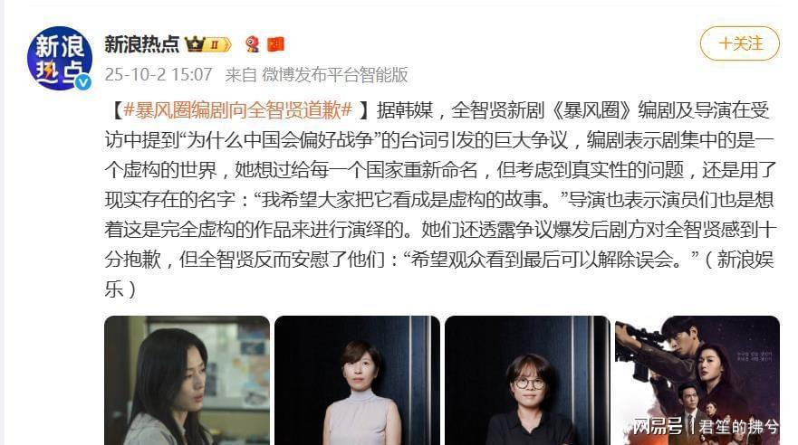 近日,韩剧《暴风圈》因一句“为什么中国会偏好战争”的争议台词在网络上引发轩然大波。10月2日,该剧编剧郑瑞景与导演金熙元紧急出面回应,试图以“架空世界”的解释平息舆论,却意外将事件推向热搜,引发更大范围的讨论。