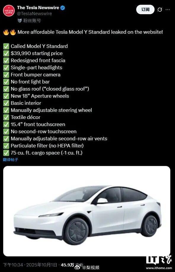 代码显示,Model Y标准款定价为39,990美元(现汇率约合28.5万元人民币),是目前特斯拉售价最低的SUV车型,定位低于长续航版和高性能版,主要面向希望加入特斯拉生态、但对豪华附加配置需求较低的消费者。
