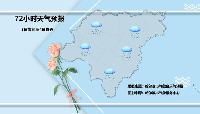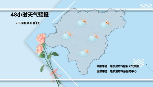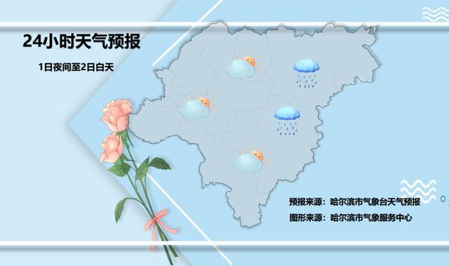哈尔滨市气象台也发布了1日夜间到4日白天的全市天气预报。1日夜间至2日白天,1日夜间东部多云有阵雨,其他多云,2日白天全市晴,西南风2~3级,最低气温中东部10~12℃,其他区域7~9℃,最高气温23~25℃。