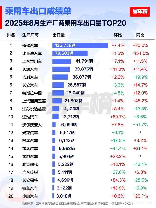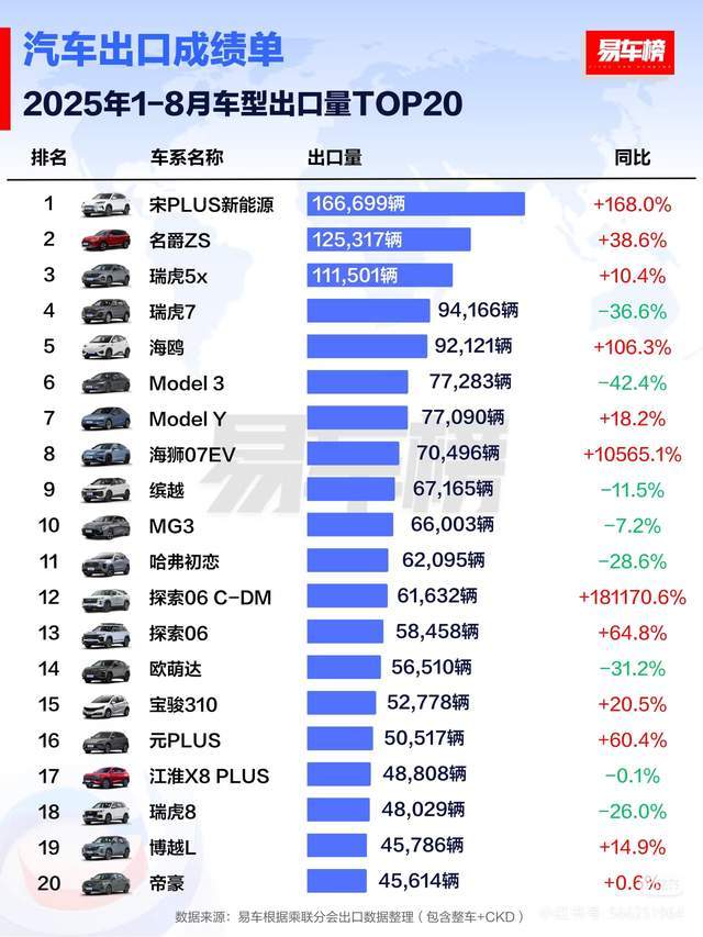 比亚迪的出色表现并不仅仅体现在总量上,其在具体车型和市场上的表现同样令人瞩目。明星车型宋PLUS新能源在前8个月的出口量超过了16.6万辆,直接夺得了车型出口榜的冠军。而在8月单月的车型出口前20强中,比亚迪一家就占据了5个席位,真正实现了“多点爆发”。