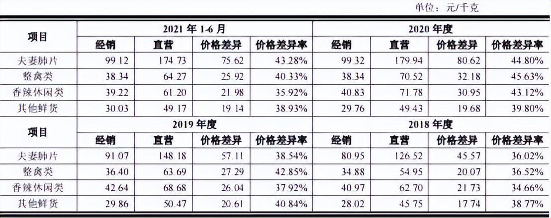 以2018-2021年上半年为例,紫燕给经销商的夫妻肺片价格,每1000克比直营店低80.62元之多。