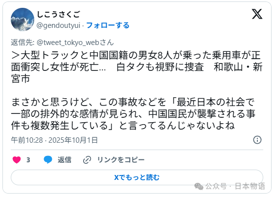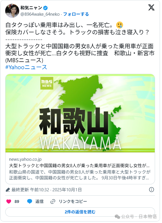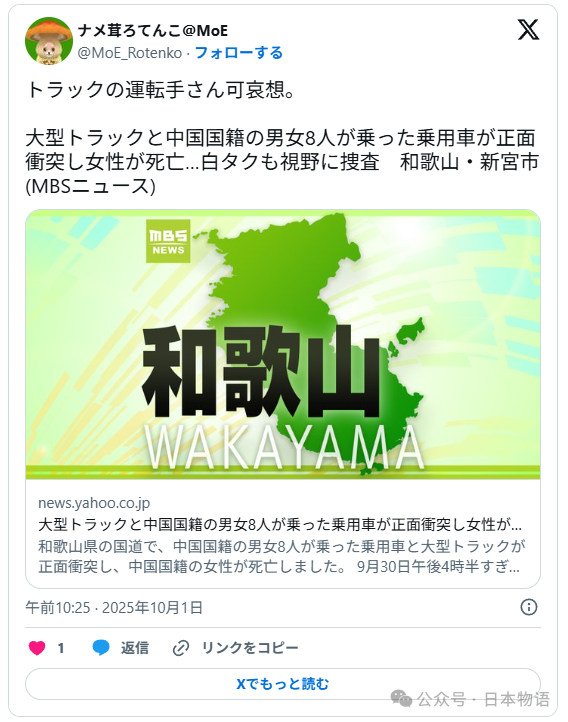 国庆假期本是家人团聚、出游放松的美好时光,然而,9月30日下午,日本和歌山县新宫市熊野川町的国道168号却发生了一起令人揪心的交通事故。一辆搭载8名中国游客的普通乘用车,与一辆大型卡车迎头相撞,结果造成1人死亡、1人重伤、6人轻伤的惨痛后果。