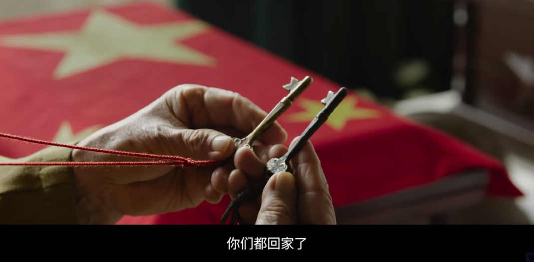 片中和平鸽被美军直升机吹飞后,姚庆祥收藏了代表眼睛的红色石头。他牺牲后,林队长将石头放回原处。战士用生命将“以战促和”推向新高度,升华了和平的符号意义。