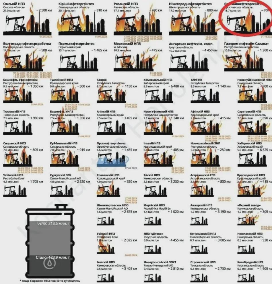 近日,乌克兰无人机对俄罗斯北部最大的雅罗斯拉夫炼油厂发动了袭击,这座年处理能力超过1500万吨、全俄排名第五的炼油厂遭遇重创。其VT-6处理装置被击中后起火,预计将被迫停工至少一个月,直接经济损失超过5.5亿美元。