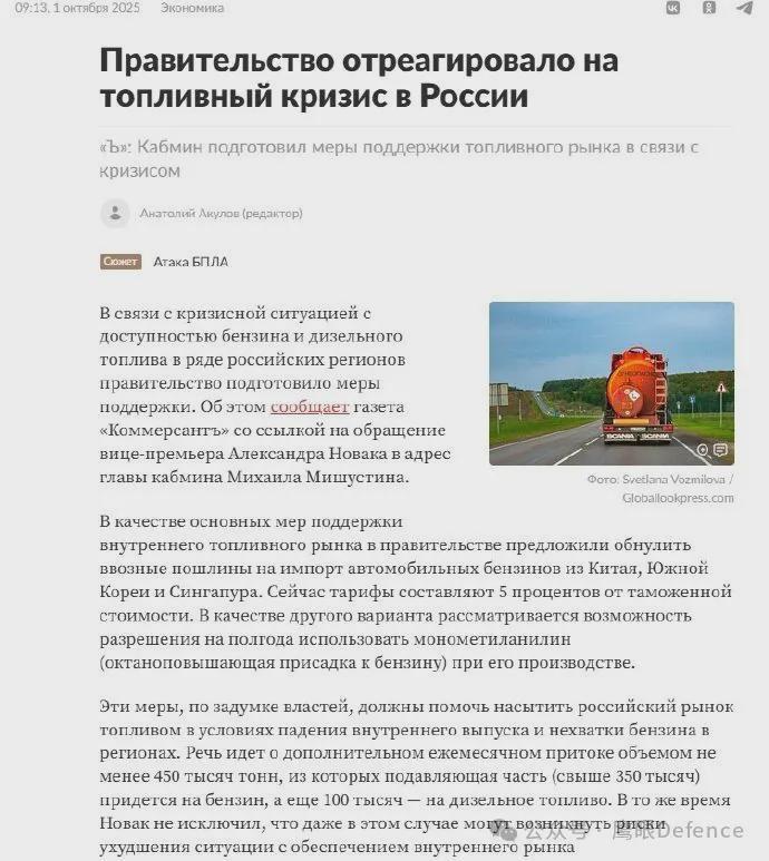 包括官方媒体在内的俄罗斯媒体已经承认目前严重的燃油短缺问题。俄广电(RBS)援引量化信息机构Siala的数据报道称,截至9月28日,俄罗斯38%的炼油能力已处于停产状态。如果考虑到刚刚遭袭的雅罗斯拉夫炼油厂,这个数据很可能已经超过了40%。