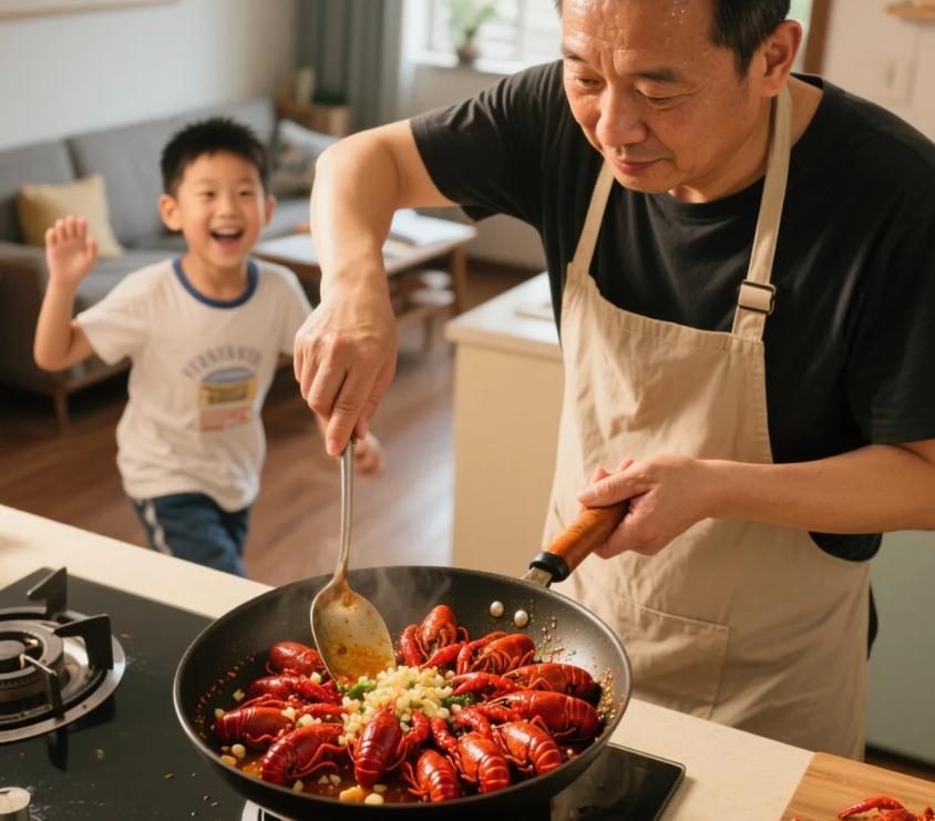 "乐乐,来尝尝爸爸做的小龙虾!"张建国兴奋地喊道。