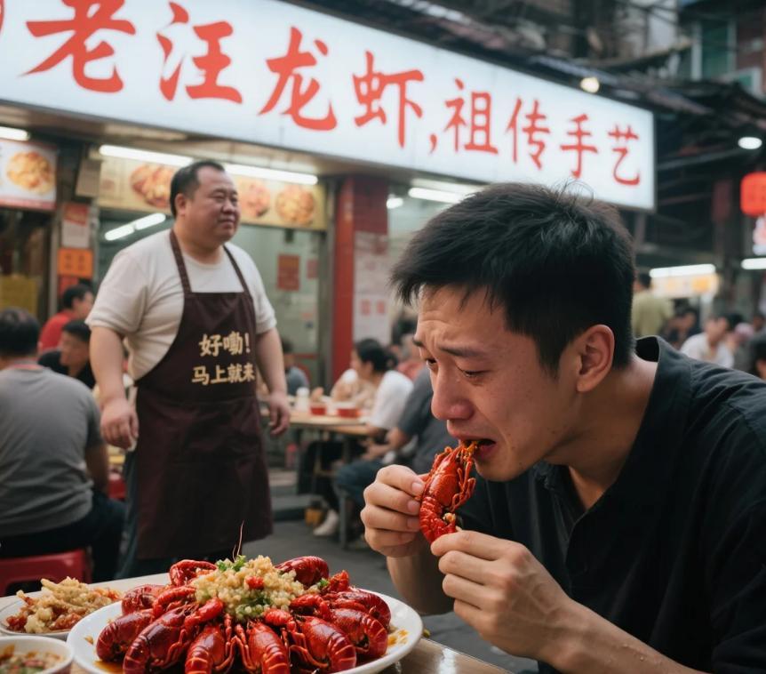 他循着香味找去,看到一家生意火爆的大排档,门口摆着一个大招牌:"老汪龙虾,祖传手艺"。