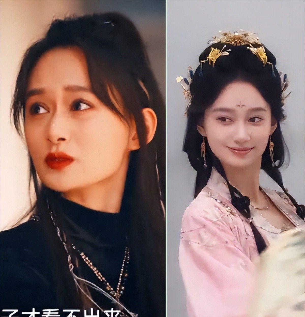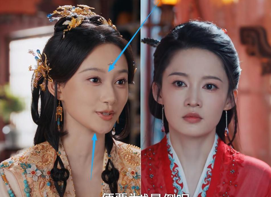 侧面视角中,她兴奋地与皇后商议和亲事宜时,原本夸张的长眼角突然消失不见,眼睛不仅缩小一圈,还显得短促局促,前后反差巨大。正如网友调侃:“一旦脑补袁弘说话时歪嘴的样子,就再也出不来了。”显然,她那难以捉摸的面部结构让人不由自主联想到表情失控的袁弘,产生强烈违和感。再者,每当夏梦与李沁同框出镜,画面中总弥漫着一股难以言喻的违和气息:下巴线条凹陷,眼角处理僵硬别扭,整体妆造与表演都显得极为不协调。相比之下,李沁的脸型呈流畅U型,五官分布和谐自然,左右对称,毫无高低偏差或人工痕迹。
