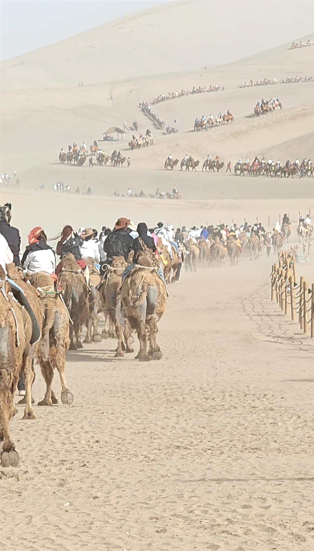在鸣沙山的沙丘上,密密麻麻地坐满了游客,上山的爬梯也挤满了不断向上攀登的游客。与此同时,一旁的骆驼大队绵延数里,形成了独特的“堵骆驼”景观。这一现象迅速在网络上引发热议,成为假期旅游的又一热点。