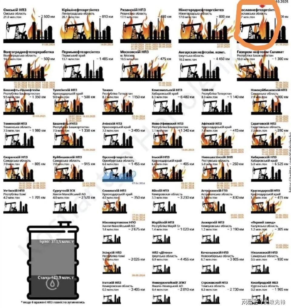 随着美国情报支持的升级,乌克兰无人机对俄罗斯能源设施的攻击愈发猛烈。10月1日,乌军无人机袭击了俄罗斯第五大炼油厂——雅罗斯拉夫尔炼油厂。至此,俄罗斯毗邻欧洲的46个炼油厂中已有26个遭袭,其中奥尔斯克等炼油厂被彻底摧毁。俄罗斯十大炼油厂中,已有八家受到无人机攻击,炼油产能直接损失达38%。
