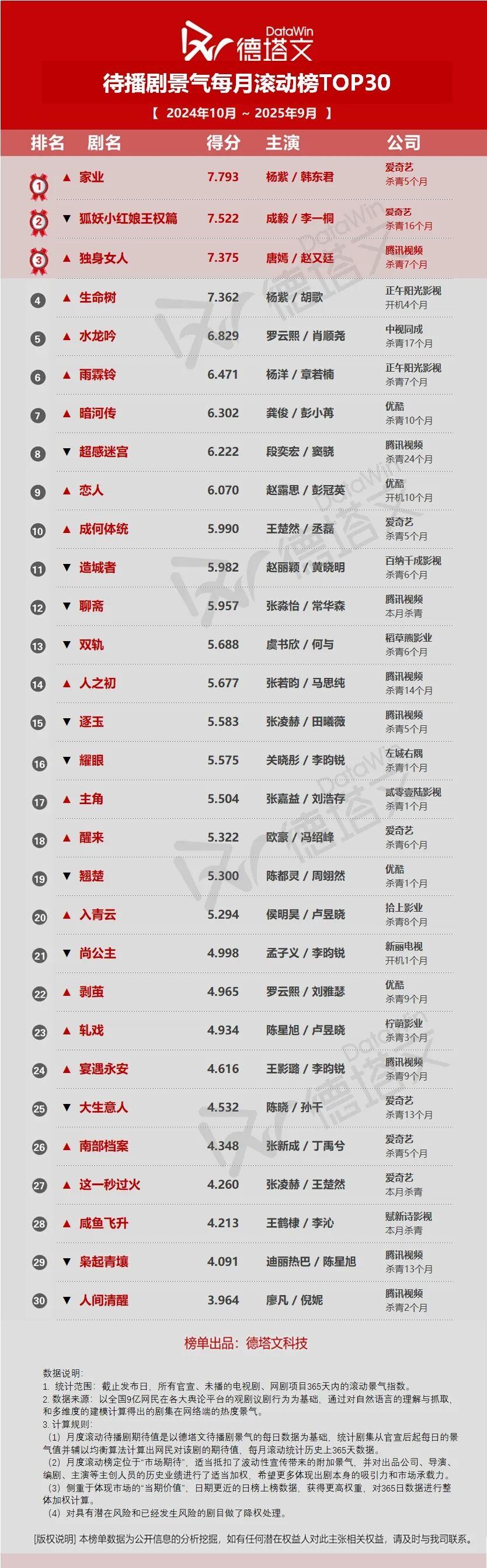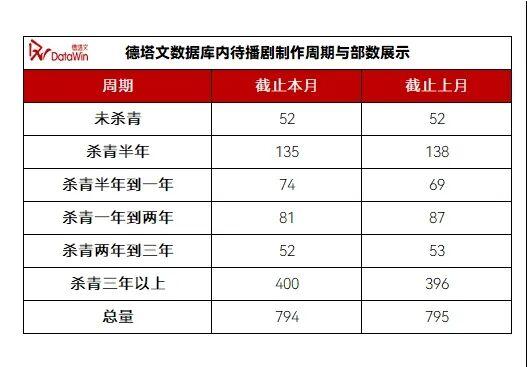 截至9月底,德塔文记录在案的待播剧中,按照制作周期的统计和与上月比较结果如下表。整体来看,市场保持了稳定的供给: