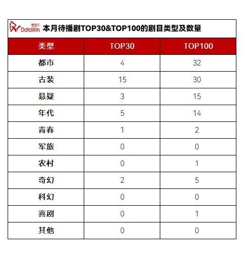 截至9月底,德塔文记录在案的待播剧中,按照TOP30及TOP100的各类型剧数量统计结果如下表。