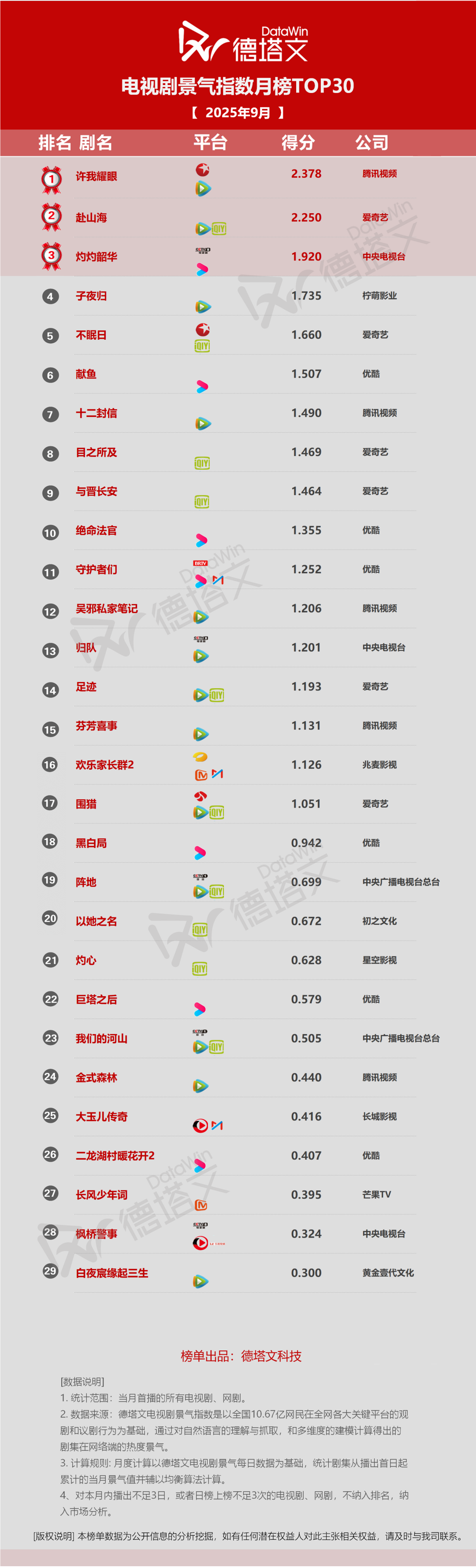9月,本月首轮在播剧共计35部,其中属于本月新开播的剧目数量22部。本月,月末播出的《许我耀眼》表现出众,借助赵露思的黑红形象与角色的契合、以及恶女题材的新鲜感,一举登顶,令腾讯视频一扫下半年阴霾、扬眉吐气。《赴山海》虽经过一番舆论波折,但最终成毅在该赛道的号召力、以及剧集自身创新的武侠改编仍然受到了一定的观众认可,在九月相对较冷的档期获得佳绩。《灼灼韶华》的大女主年代剧也凭借其高制作水准、精彩的剧本设计赢得头部市场地位。