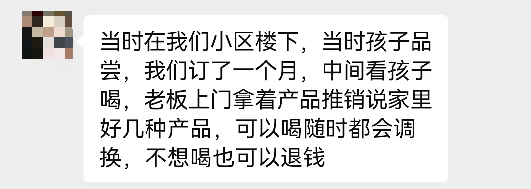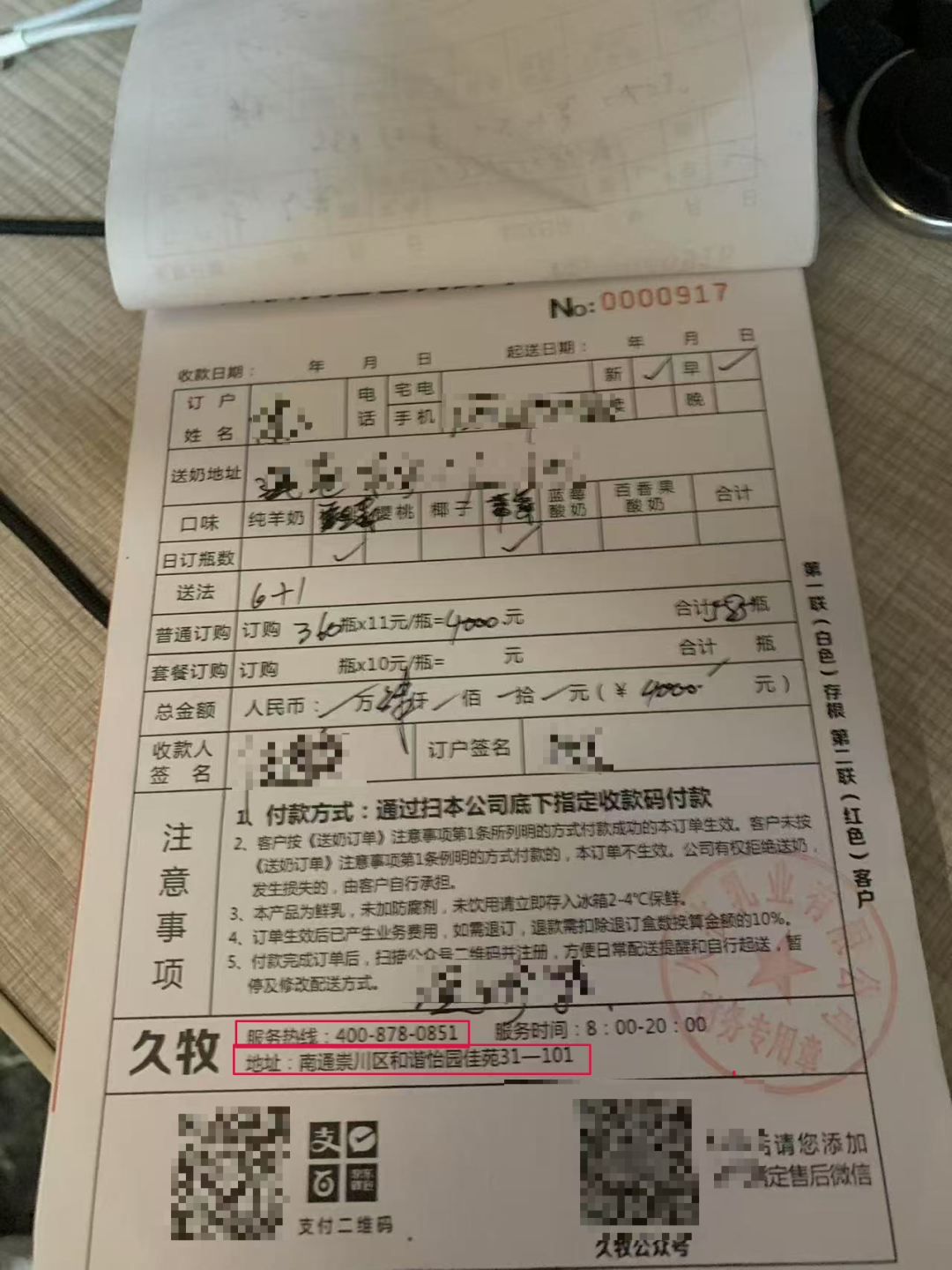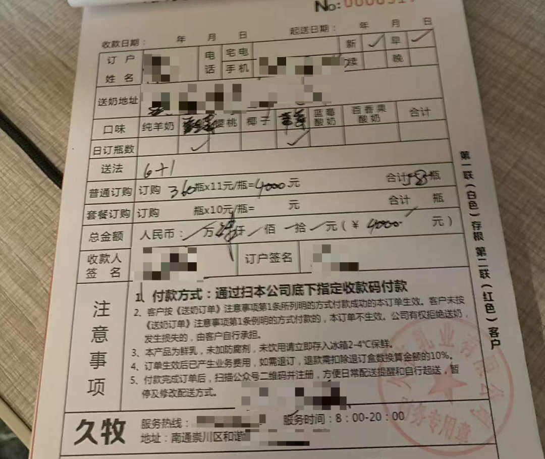 据该消费者介绍,其在南通开发区云樾东方小区楼下参加了商家的宣传活动,孩子品尝了商家提供的鲜羊奶产品后,觉得口感很好。随后,商家又上门推销,消费者便一次性订购了615瓶鲜羊奶,并签订了送奶订单。