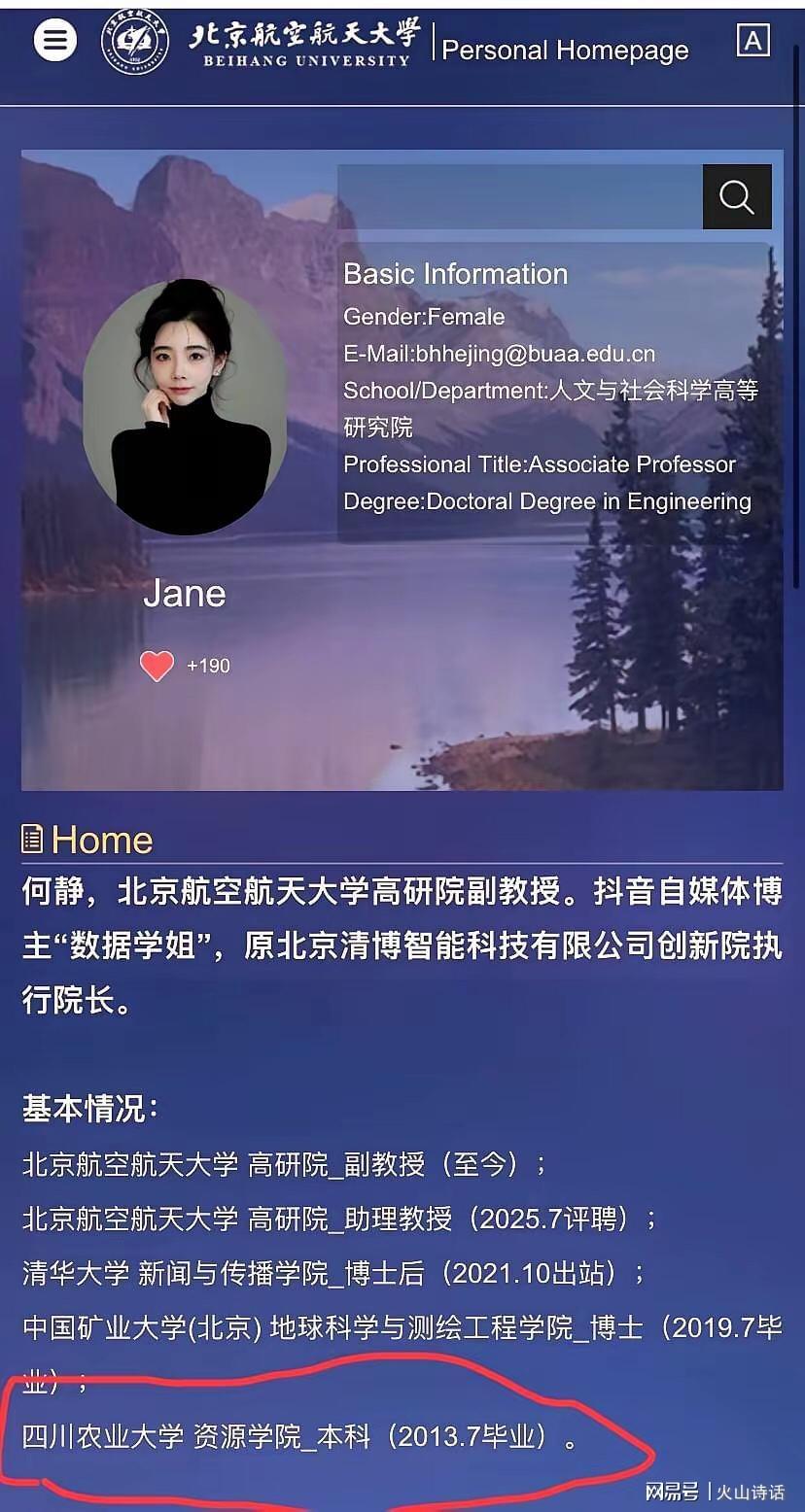 据公开资料显示,何静现任北航人文与社会科学高等研究院科技治理中心副主任、副教授,同时是抖音自媒体博主'数据学姐'。其学术履历显示:2013年本科毕业于四川农业大学资源学院,2019年获得中国矿业大学(北京)地球科学与测绘工程学院博士学位,2021年完成清华大学新闻与传播学院博士后研究,现专注于AIGC、大数据及网络舆论研究。