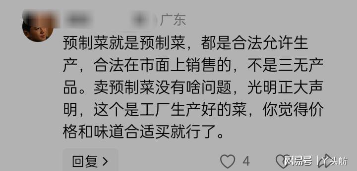 对此,有人认为预制菜本身就是合法允许生产、合法在市面上销售的,并非三无产品。卖预制菜没有问题,关键是要光明正大地声明这是工厂生产好的菜,让消费者觉得价格和味道合适再购买。