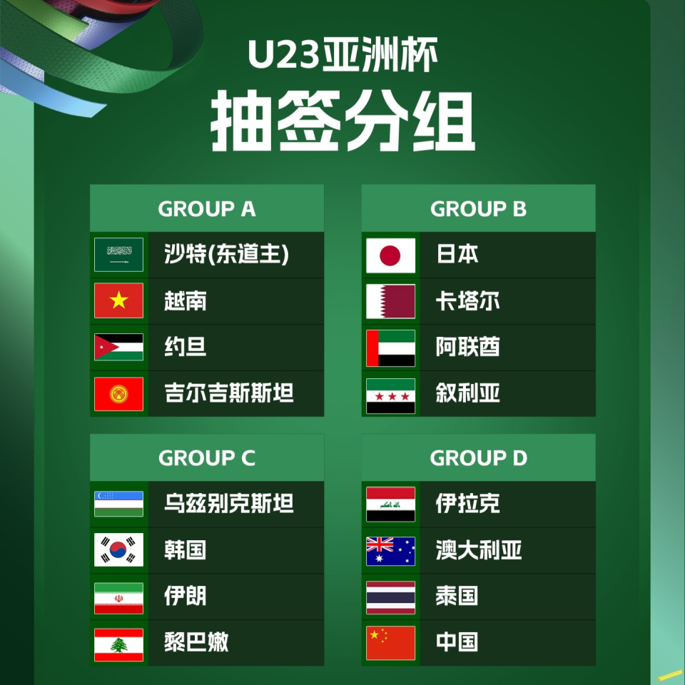 2026年U23亚洲杯将于明年1月6日至24日在沙特举行。根据亚足联公布的赛程安排,中国队将在首场比赛中迎战D1档的伊拉克队,第二场对阵D2档的澳大利亚队,第三场则与D3档的泰国队交锋。