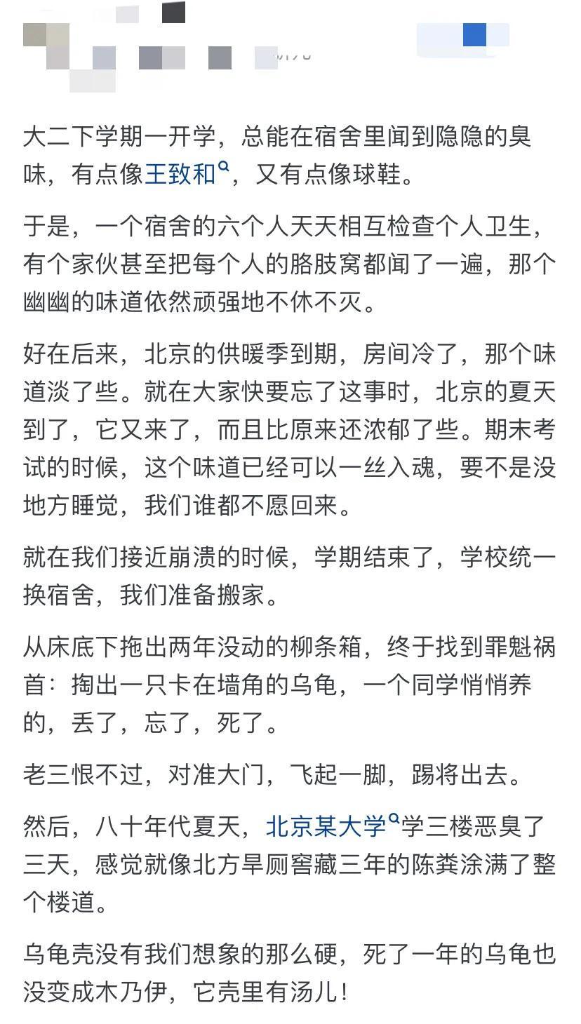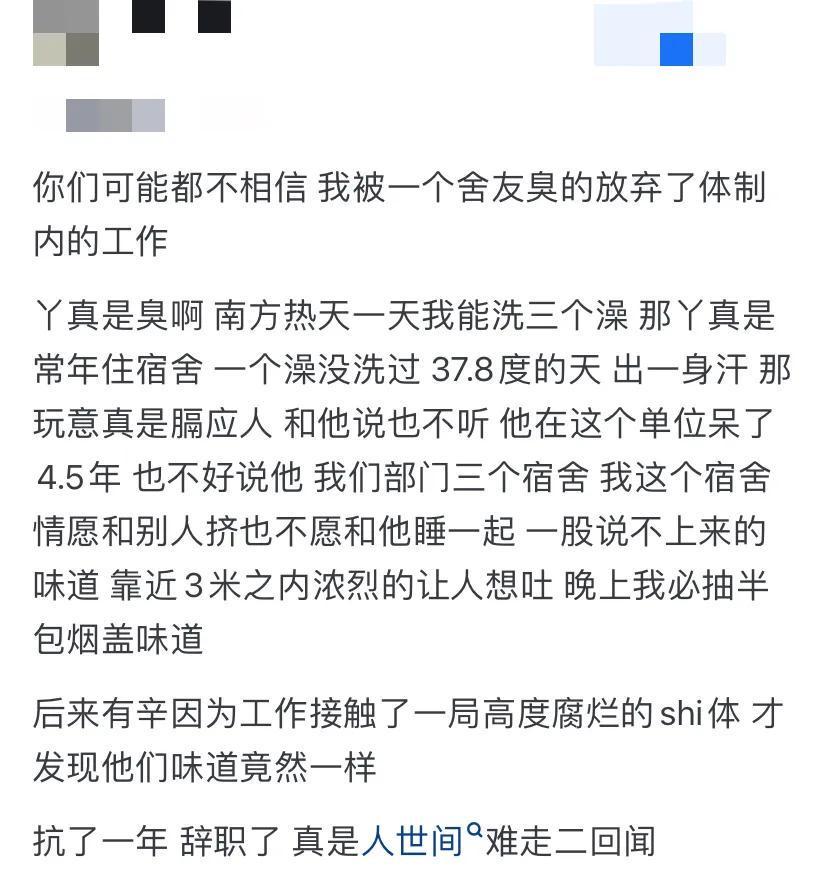 还有网友吐槽同事的体臭:我又想起一个同事,回想起来都难受。他臭到走过的地方都留下了臭味(室内),很难想象。他从楼上下来,我隔了一会也走那段路,臭得我以为保洁阿姨的拖布臭了。后来在楼下碰到他,发现更臭了,后来才意识到就是他。