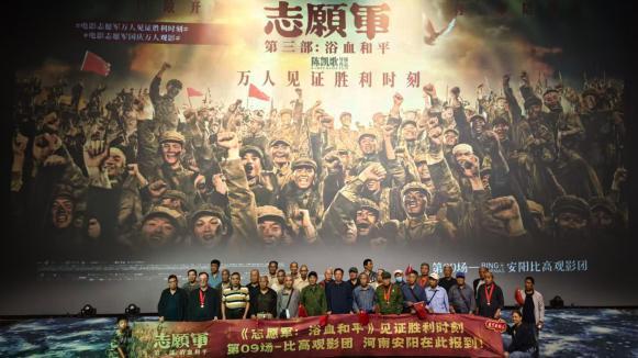 在宁夏银川,观众刘先生在放映结束后谈到:“抗美援朝打了近3年,电影《志愿军》陪了我们3年,这段历史不能忘不敢忘,所以收官之作肯定是要来看的!我家小朋友今天也来了,前两部看完他还哭得稀里哗啦,今天看完好像是有点小骄傲的意思。”在河南安阳,退伍军人的代表们步入电影院,在大银幕上亲眼目睹了中国人民志愿军的辉煌胜利。