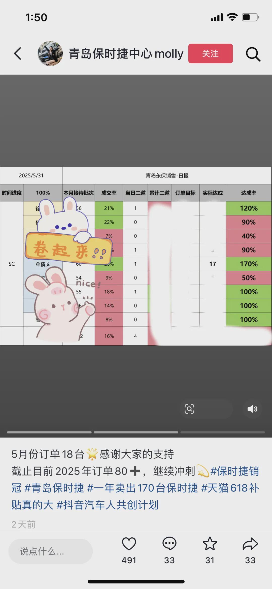 6月1日,这位连续两年创下年销170台保时捷纪录的女销冠在社交平台发文称,截至当时今年已卖出超80台车。她详细分享了自己的销售数据:“5月完成18台订单,4月订单20台,截止到2025年5月订单总量已超80台。虽然厂家减产对销售造成一定影响,但我会继续努力完成目标。”