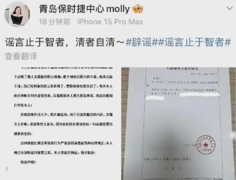 牟倩文在接受采访时回忆此事称,今年2月一个客户发信息说:“molly姐,你被人‘造黄谣’了。”她当时回应:“没事儿,之前2023年的时候也被造过。”但这次情况不同,造谣视频不断发酵,浏览量可能达900多万。她当天就去报警了,立案后继续追查,但目前尚未收到进一步答复。“后来我发现,怎么解释都没有用,到昨天还有人给我打电话,说一些不合适的话。”