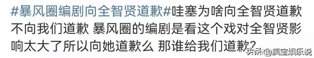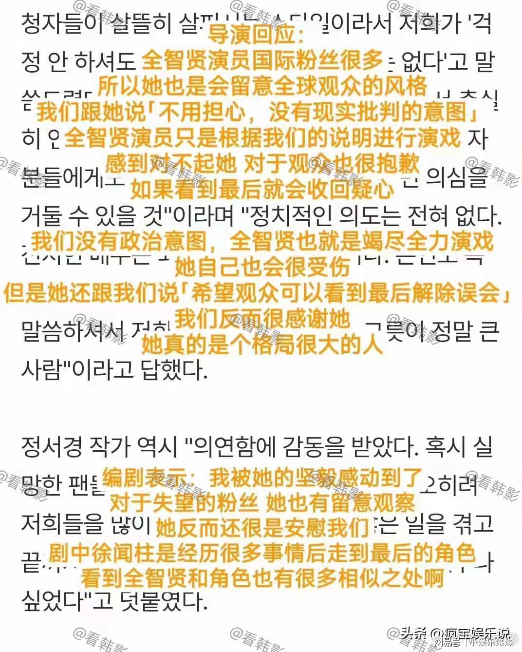据悉,《暴风圈》的导演金熙元以及编剧都回应了对全智贤的抱歉,并称赞她是个格局很大的演员。然而,全文却闭口不提对中国的道歉,只是用“虚构”“只是一模一样罢了”来敷衍剧中的所有诋毁。