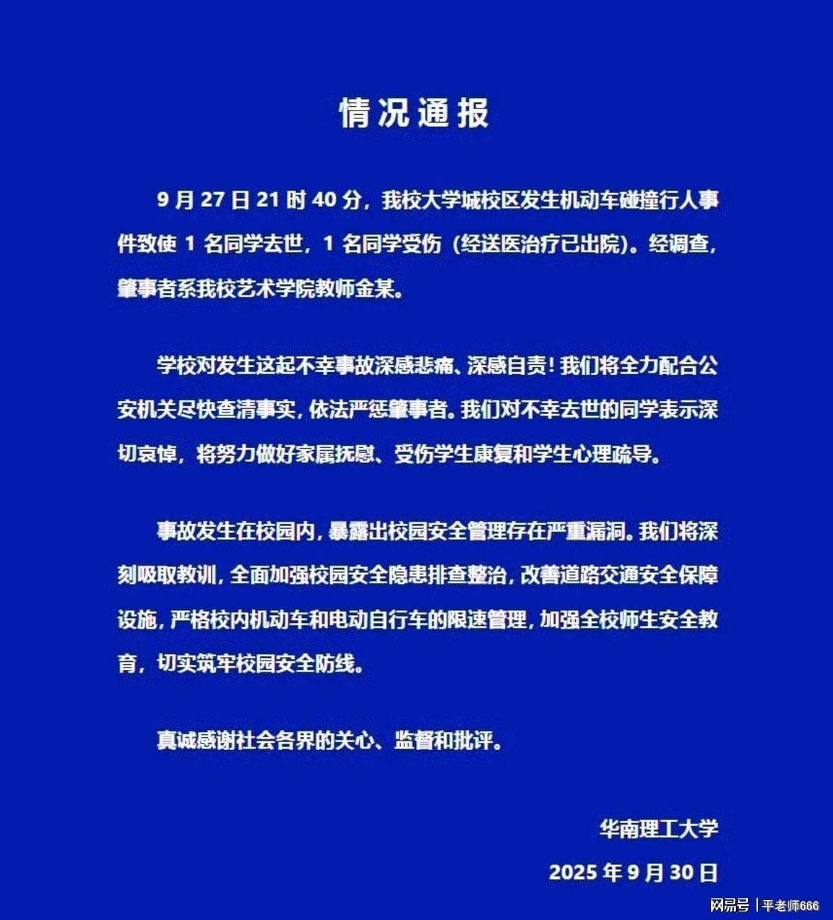 9月27日,华南理工大学大学城校区发生一起惨烈车祸。一名刚入学20余天的18岁大一女生,在宿舍区下楼扔垃圾时,被艺术学院教师金雷驾驶的宝马车撞倒,当场身亡。现场视频显示,肇事车辆车头严重变形,令人触目惊心。这起悲剧不仅让一个年轻生命戛然而止,更引发社会对校园交通安全的深度质疑:谁该为这场悲剧负责?