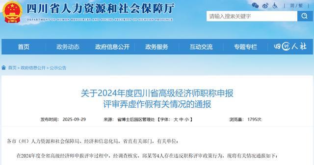 近日,四川省人力资源和社会保障厅与四川省经济和信息化厅联合发布通报,针对2024年度四川省高级经济师职称申报评审过程中出现的弄虚作假行为进行了严肃处理。经详细调查核实,邱某等4人在申报评审过程中存在严重违反职称评审政策的行为。