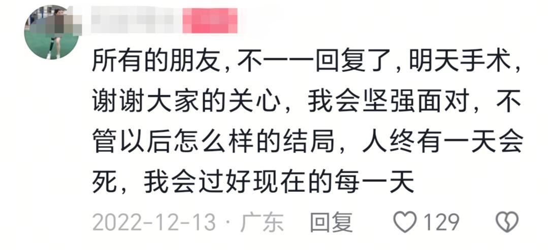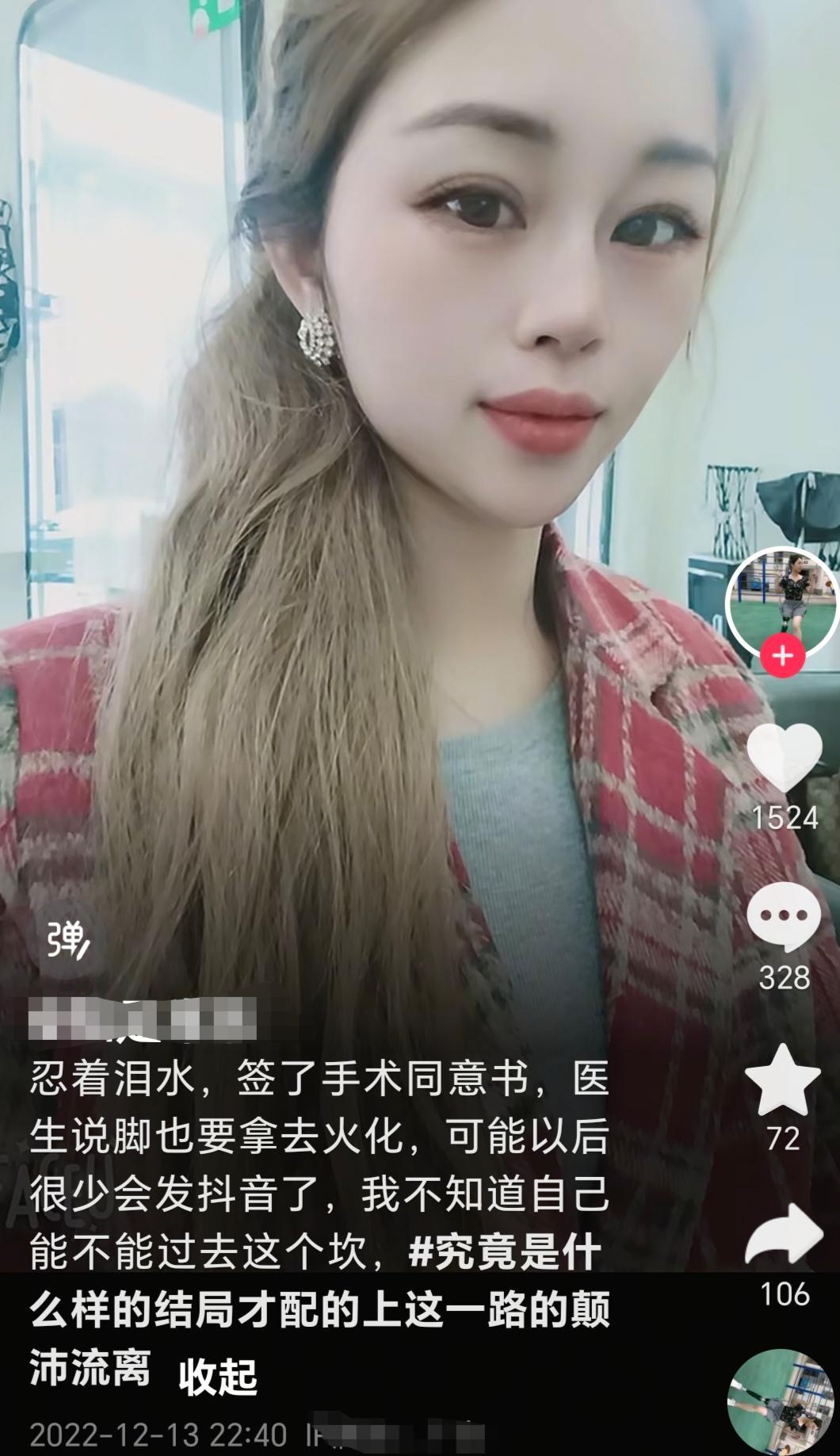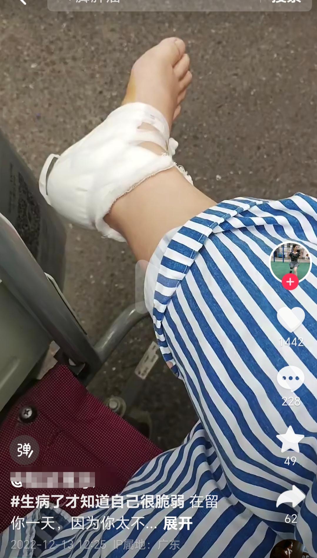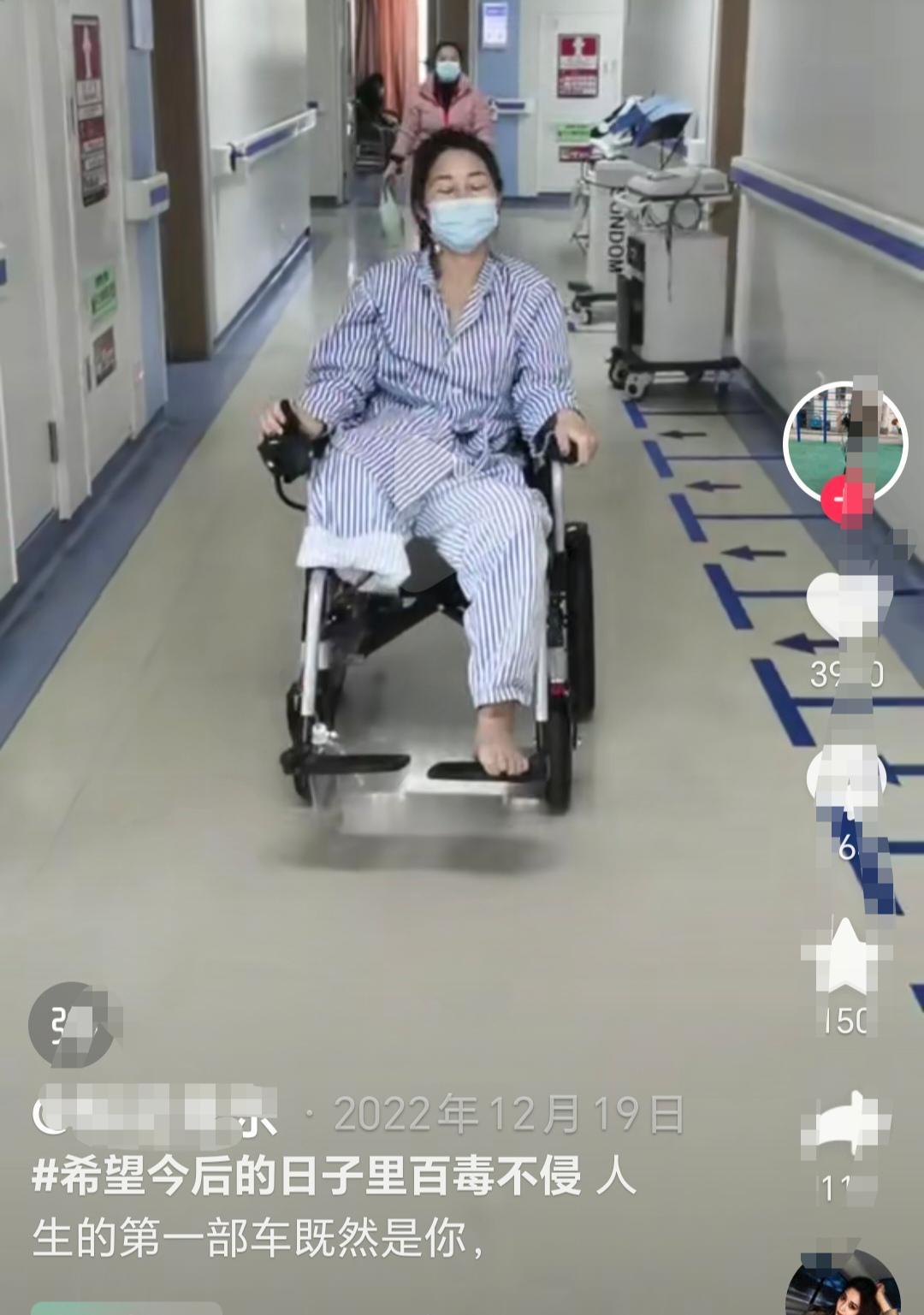 2022年12月19日,手术后的黄紫燕坐在电动轮椅上,右裤腿空荡荡的,她发了一个抖音视频,自嘲地说没想到人生的第一辆车居然是轮椅,也希望以后的自己能够百毒不侵。