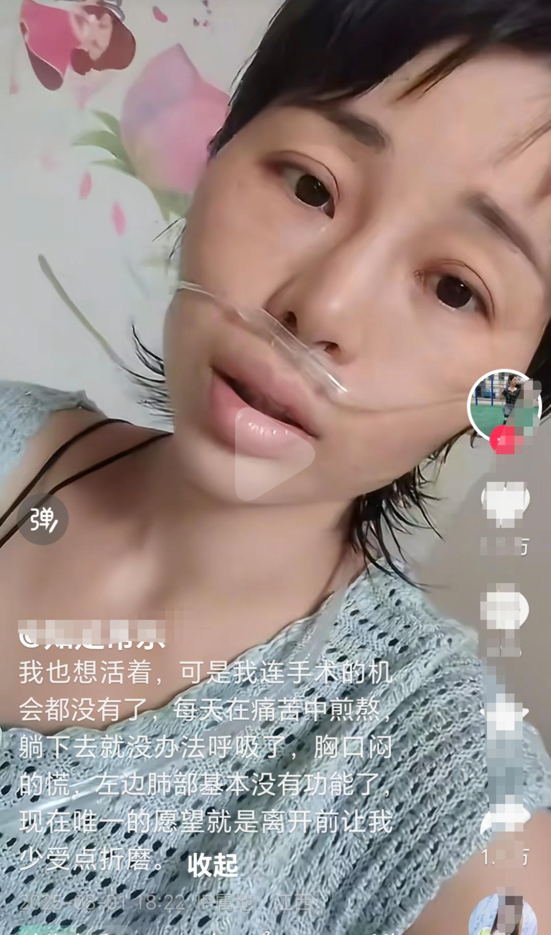 8月1日,黄紫燕又拍了一个视频,同样的衣服,但人就憔悴了很多,而且还吸上了氧气,说话都有些费力气了。她很难受,躺不下去,躺下去都没有办法呼吸,胸口发闷,非常的痛苦。原来是左边的肺已经被肿瘤侵蚀得没有功能了。