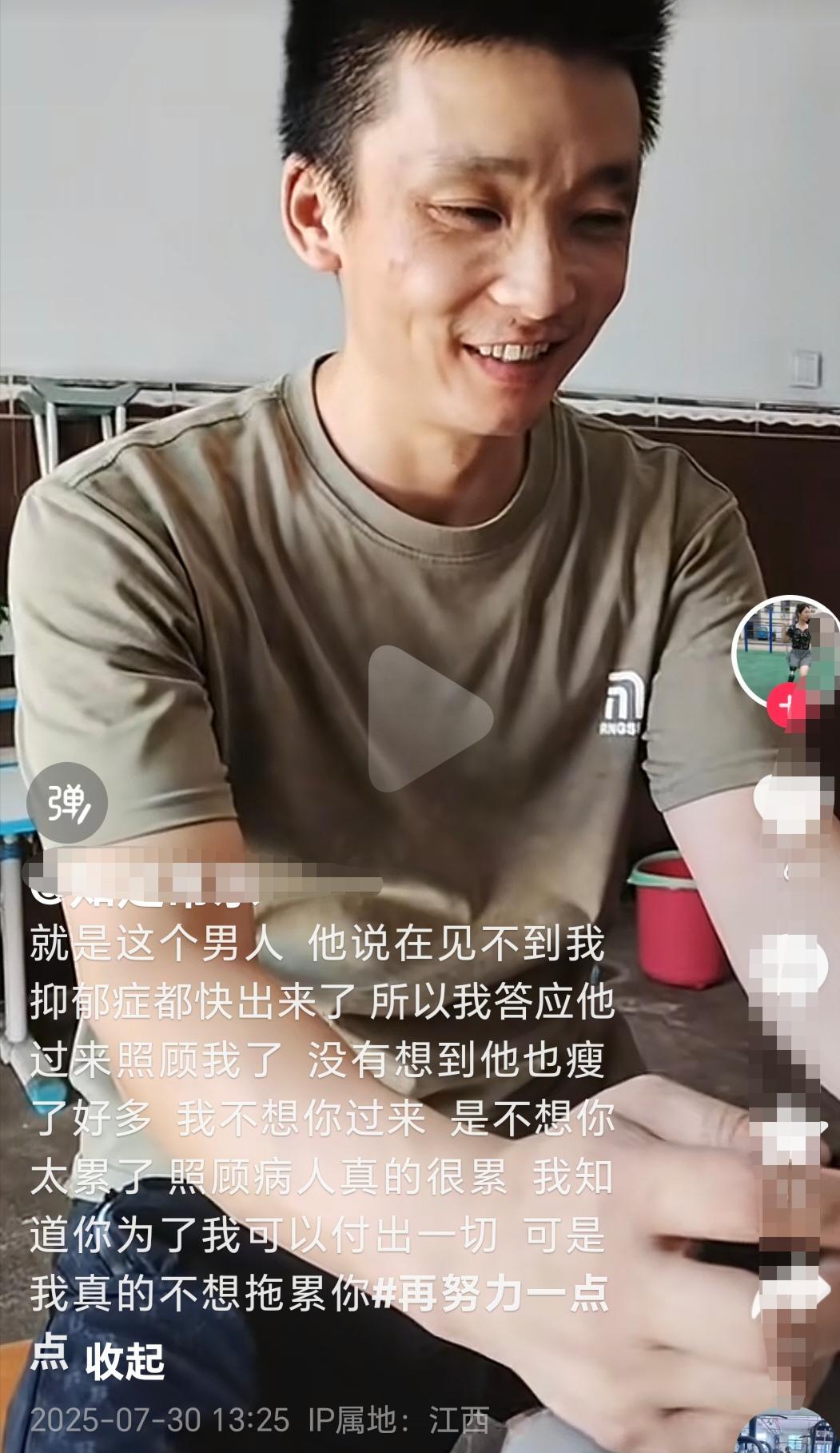 还好她有一个爱她的老公,在得病的日子里对她不离不弃。即使妻子怕他累,不想让他照顾,他也是跑过来给妻子按摩、说说话,怕她难受痛苦。