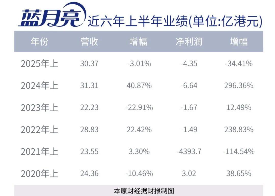 2020年蓝月亮上市,市值一度突破1000亿港元,却又陷入“每逢上半年必亏损”的怪圈。2025年中期业绩也不例外:营收30.37亿港元,同比下滑3.01%;亏损4.35亿港元。