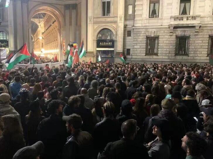 消息传回欧洲后,欧洲人彻底愤怒了。即便已经是深夜时分,很多人仍然高举巴勒斯坦旗帜走上街头呐喊。在意大利,愤怒更是燃烧在人们的心头,一些人甚至占领了铁路以表达不满。