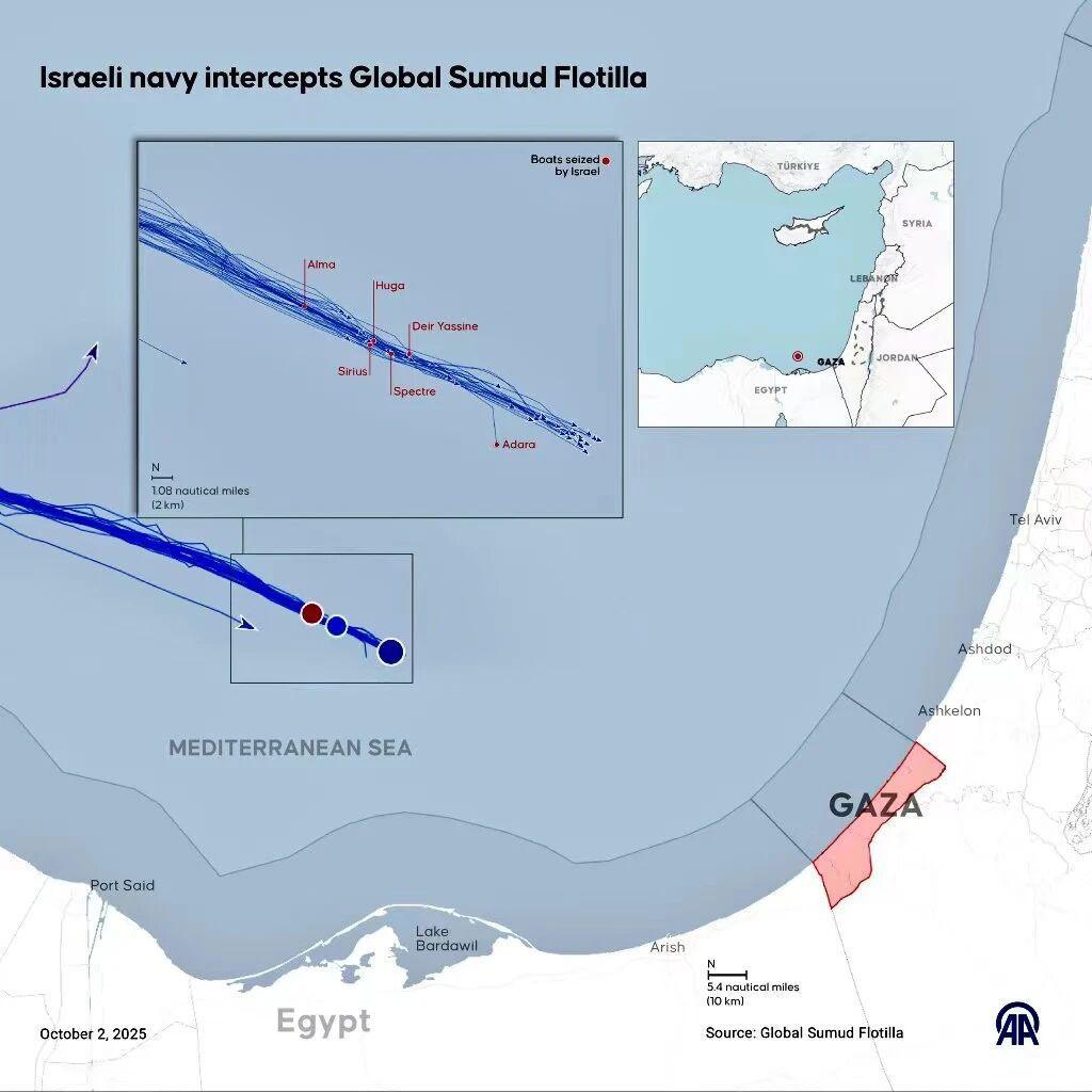 但以色列的狠辣手段却是不容置疑的。10月1日夜,以色列海军拦截了这些船队,我们可以听到视频中“举起手来”的怒吼声。随后消息传出,多艘船只已遭以军扣押,包括通贝里在内的很多人被以军逮捕。