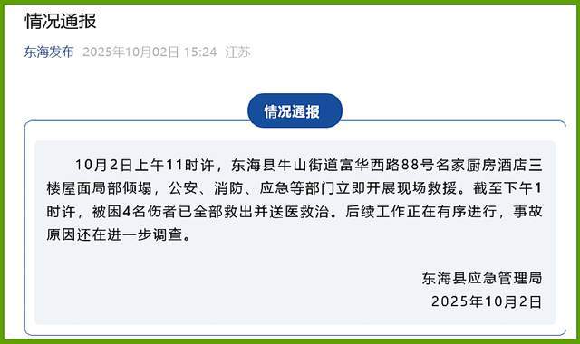 2日下午15时38分,东海县应急管理局特地发布情况通报,回应此事。通报证实,当天上午11时许,该县牛山街道富华西路88号名家厨房酒店三楼屋面局部倾塌。截止到下午1时许,被困4名伤者已全部救出并送医救治。