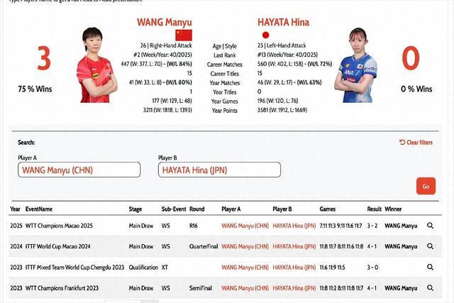 北京时间10月2日晚,WTT中国大满贯女单1/8决赛上演焦点对决,国乒核心王曼昱与日本名将早田希娜展开强强对话。最终王曼昱以3-0(11-6/11-4/11-5)的绝对优势横扫对手,顺利挺进八强。比赛第三局出现的裁判警告插曲,反而成为王曼昱展现强大心理素质的经典时刻。