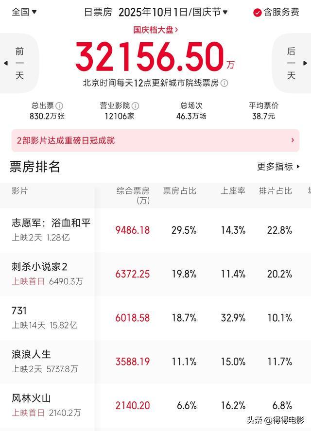 第一天结束,排名第一的是《志愿军》,第二《刺杀小说家2》,第三是那部不能评价的电影。