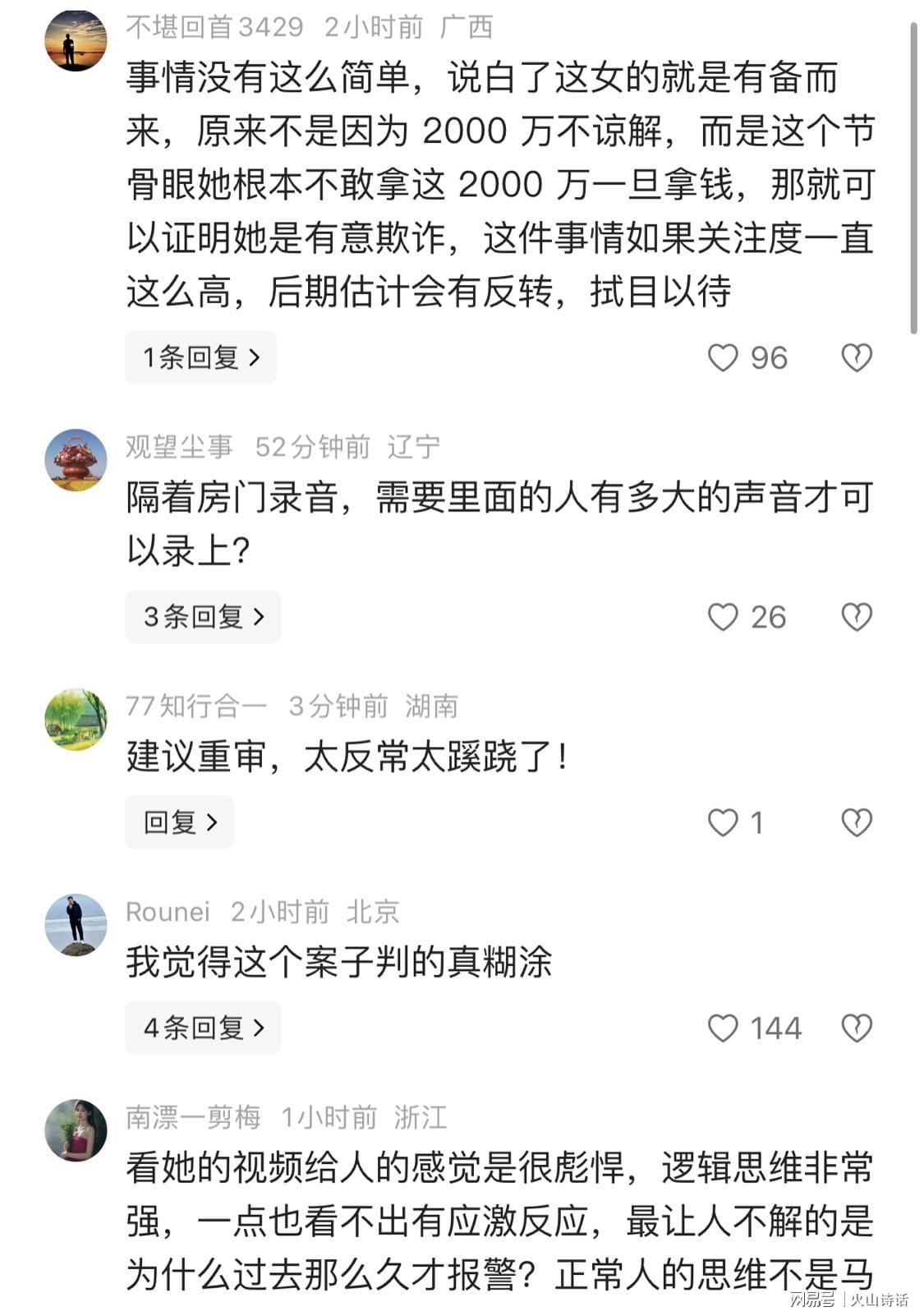 有网友留言质疑崔丽丽:“为什么当时没有报案?却过了十天半月再返回(案发地)报案?你自己也在多媒体访谈中承认自己抛出要2000万元私了……”对此,崔丽丽毫不示弱,怒怼网友称:“多久报案是‘老娘’的权利,你管得着吗?”此言一出,立刻引发了新一轮的关注和讨论。